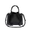 Sua estrutura média no estilo bucket proporciona amplo espaço interno para acomodar seus itens essenciais com folga e organização. O fechamento em enforcador garante praticidade no uso diário, enquanto a alça de mão em rolotê de couro trançado, fixada por nós e finalizada com franjas longas, confere um toque artesanal e dinâmico à peça.