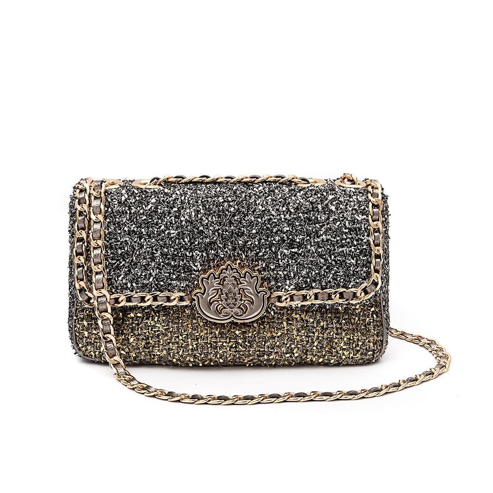 Com tamanho médio e presença marcante, a Bolsa Baguete Tweed Metalizado é ideal para quem busca praticidade com um toque de brilho.