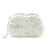 Esta bolsa clutch, no clássico shape abaulado que comporta todos os tamanhos de celulares, tem a sua individualidade dada pela riqueza da marchetaria de madrepérola totalmente handmade. Possui alça longa em corrente snake de metal e forro em tecido jacquard adamascado. Uma bolsa consagrada pelo tempo e com sensibilidade moderna, perfeita para compor looks de ocasiões especiais.