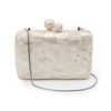 No clássico shape retangular, que comporta todos os tamanhos de celulares, esta bolsa clutch tem a sua individualidade dada pela riqueza da marchetaria de madrepérola na cor furta rose e seu sofisticado pino esfera em madrepérola. Possui alça longa em corrente snake na cor ouro e forro em tecido jacquard adamascado. Uma bolsa consagrada pelo tempo e com sensibilidade moderna, perfeita para compor looks de ocasiões especiais.