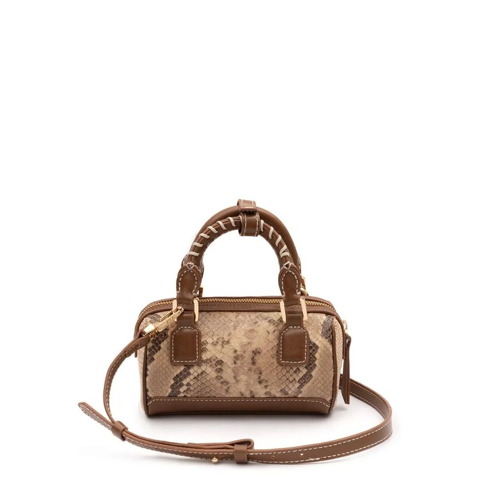 A Bolsa Mini Bowling Maia traduz o clássico shape bowling em versão compacta e trendy. Confeccionada em couro com textura croco ou estampa cobra clara com detalhes em palha natural , é um acessório que equilibra atitude urbana e sofisticação atemporal.
