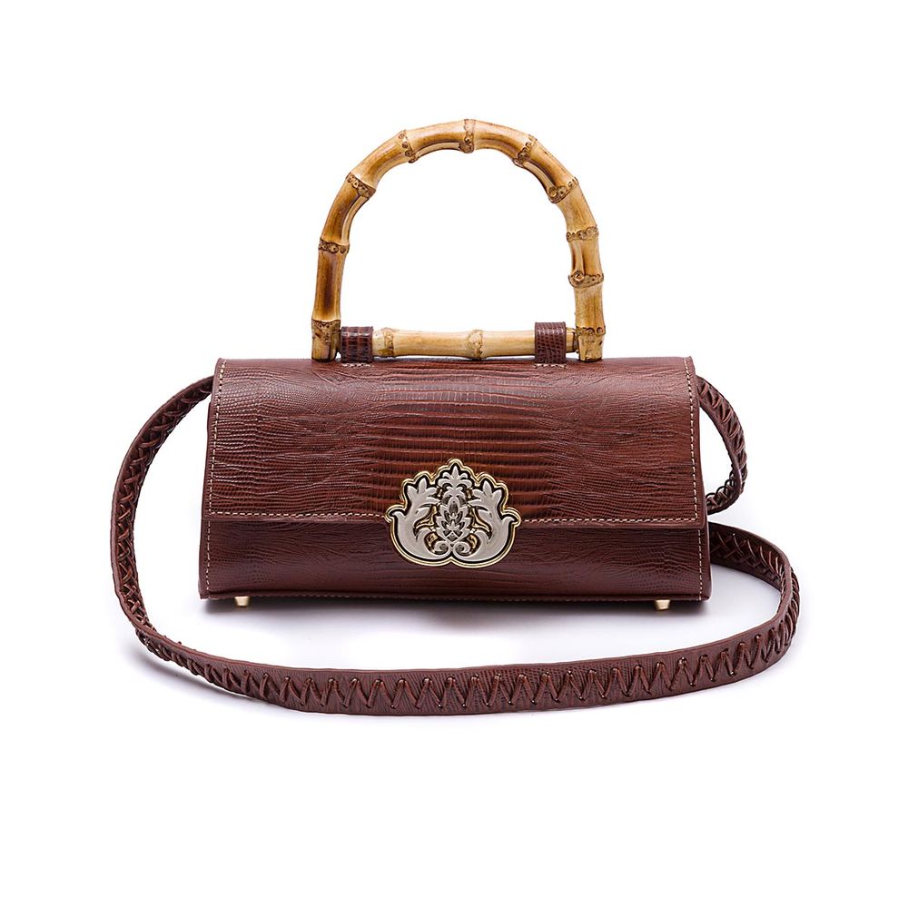 Com estrutura firme e linhas retas, acomoda os itens essenciais com organização e leveza. A alça de mão em bambu natural adiciona charme artesanal à peça, enquanto a alça longa com trança em couro oferece diferentes formas de uso — no ombro ou na transversal.