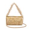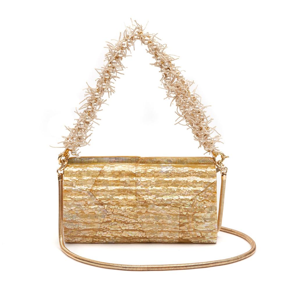 BOLSA CLUTCH BAGUETTE EM MADREPÉROLA COM RELEVO ONDULADO. MODELO POSSUI ALÇA DE MÃO COM FIO DE ALGODÃO E PÉROLAS REMOVÍVEL, ALÇA SNAKE CROSSBODY RETRÁTIL E FECHAMENTO POR ÍMÃ.