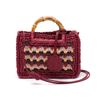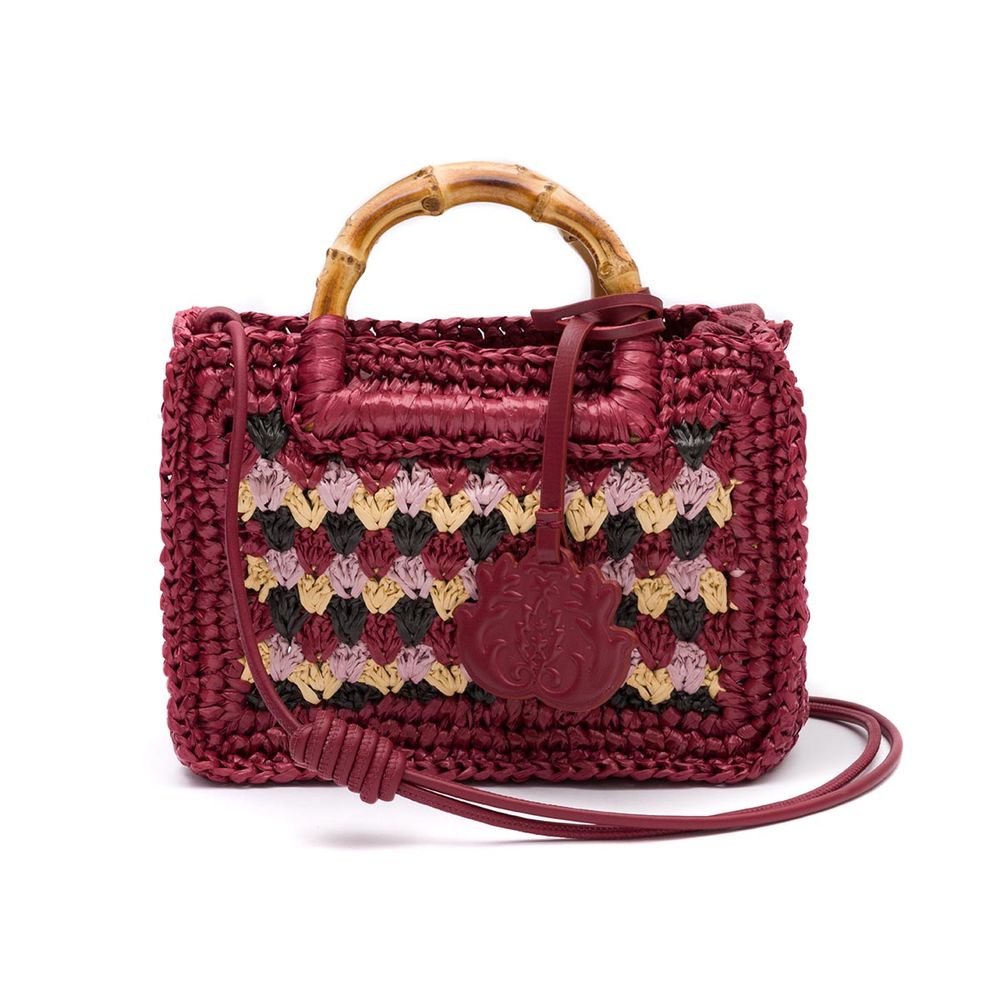 Seu shape mini tote apresenta janelas multicoloridas em tons de burgundy, blossom, preto e creme, adicionando um toque gráfico e contemporâneo à peça. A alça de mão em bambu natural reforça o charme orgânico da bolsa, enquanto a alça longa torcida em couro pespontado garante praticidade e estilo no uso diário.